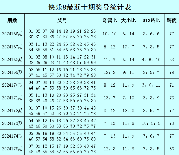 福彩快乐8第2024175期开奖回顾:07 09 12 15 17 19 32 33 40 47 48 49 55 58 62 65 66 69 70 73,其中奖号奇偶比开出12:8,大小比开出11:9,012路比开出7:8:5,和值为846,跨度为66。