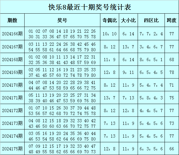 福彩快乐8第2024175期开奖回顾:07 09 12 15 17 19 32 33 40 47 48 49 55 58 62 65 66 69 70 73,其中奖号奇偶比开出12:8,大小比开出11:9,四区比开出6:3:5:6,跨度开出66。