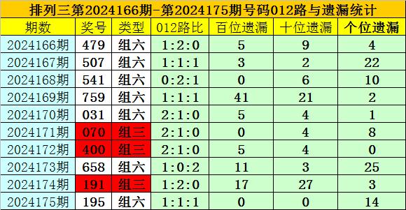 开奖回顾:排列三第2024175期奖号为:195,类型为组六,号码012路比为1:1:1,百十个位号码直选分别遗漏0期、0期和14期。