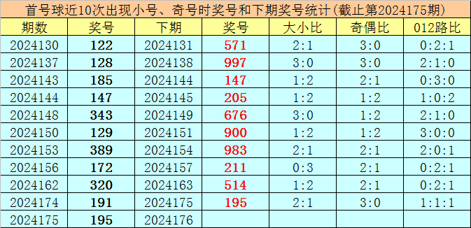 在首号球前10次开出小 号、奇号类型之后,其下期分别开出奖号:571、997、147、205、676、900、983、211、514、195,其中号码奇偶比为7:3,大小比为6:4,012路比为4:2:4。