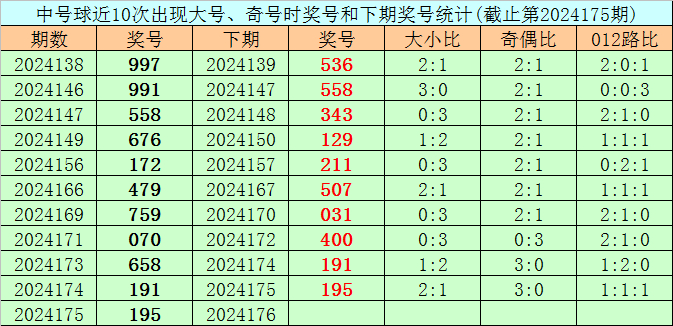 在中号球前10次开出大号、奇号类型之后,其下期分别开出奖号:536、558、343、129、211、507、031、400、191、195,其中号码奇偶比为6:4,大小比为3:7,012路比为6:2:2。