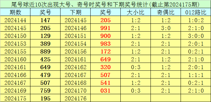 在尾号球前10次开出大号、奇号类型之后,其下期分别开出奖号:205、991、900、983、172、649、320、507、541、031,其中号码012路比为4:4:2,奇偶比为7:3,大小比为3:7。
