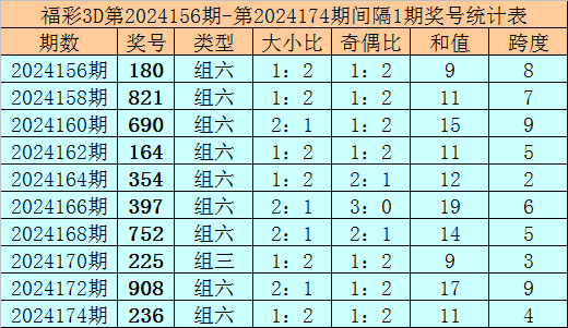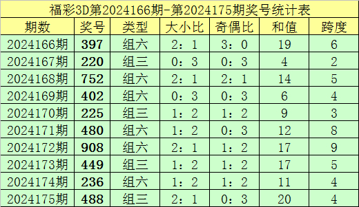 其中大小比2:1,奇偶比0:3,和值20,跨度4。