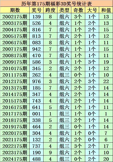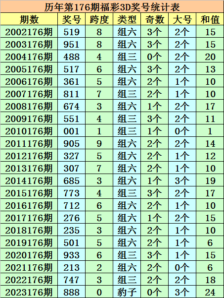 在以上奖号中奖,历年第176期福彩3D出现1次豹子,出现7次组三,出现14次组六。组六开出比例较高,本期继续关注组六。