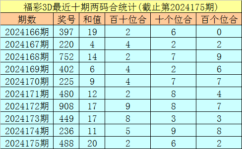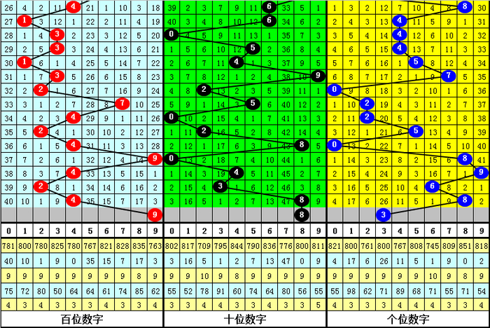 百个位合:前10期百个位两码合开出:0、2、9、6、7、4、7、3、8、2,其中百个位两码合012路比为4:3:3,奇偶比为4:6,本期参考百个位两码合开出偶数,两码合关注2、4、8。