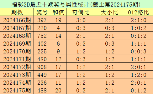 开奖回顾:第2024175期福彩3D奖号为488。奖号形态为组三,大小比为2:1,和值为20,奇偶比为0:3,012路比为0:1:2,跨度为4。