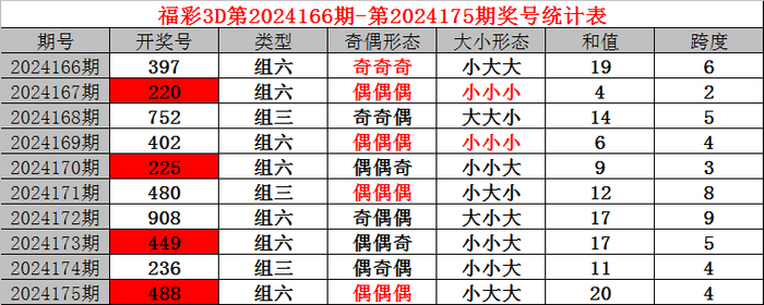 上期回顾:福利彩票3D第2024175期开奖结果488。奖号:偶偶偶、小大大,和值20,跨度4。