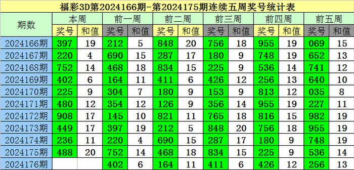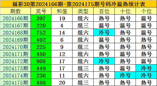 上期回顾:福彩3D第2024175期开奖奖号为:488,奖号类型为:组三,奖号冷温热态为:热号+热号+热号。
