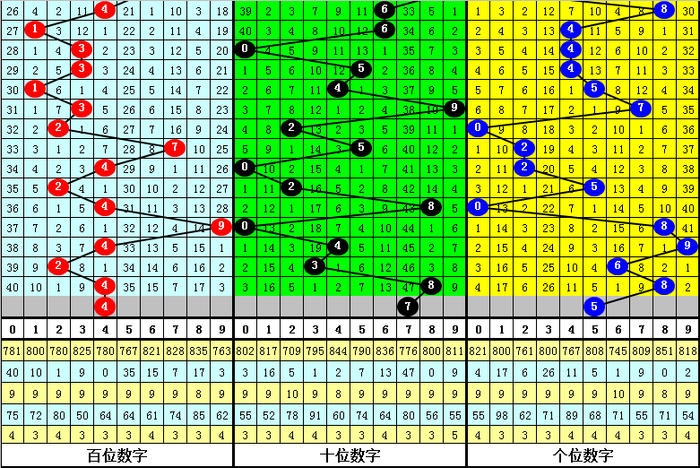 百位上期出现:热号4,该位连续十期以热号出现较多,以温号、冷号出现较少,目前百位热号有3个:2、4、9,本期看好开出热号再次出现,参考号码4。