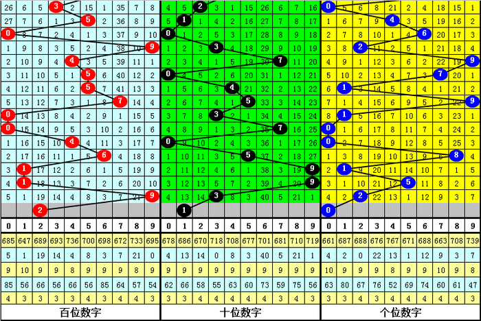 在最近9期开出奇偶分布:奇奇偶的奖号为:336-518-538-536-558-936-172-514-932,在下期出现号码分别为:218-246-835-520-343-389-211-006-479。其中百十个位号码分布情况如下: