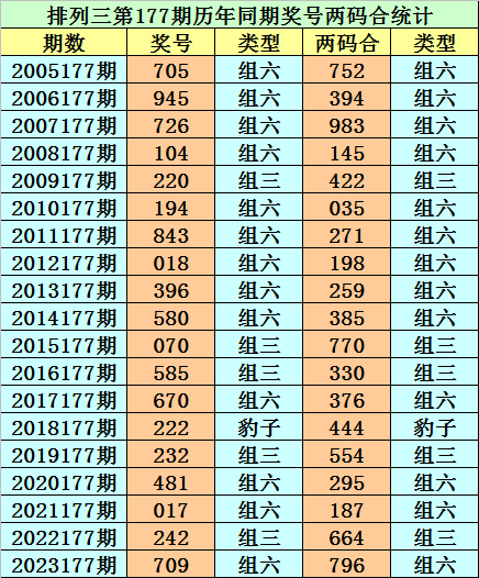 在历年同期中两码合开出年限分别为:5出现7年,3、4、7、9出现6年,2出现5年,1、8出现4年,0、6出现3年,第2024177期预计两码合出现:0、3、5。