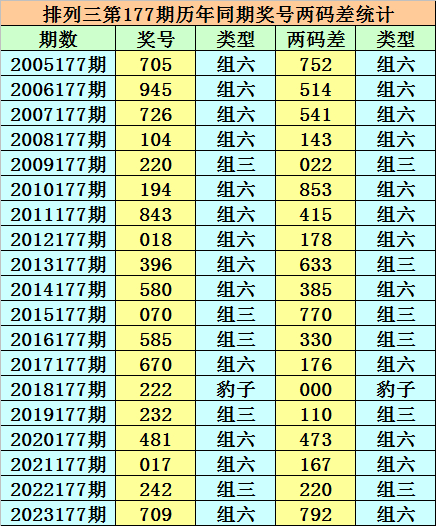 在排列三第177期历史同期开奖中,各号码两码差分别为:257、145、145、134、022、358、145、178、336、358、077、033、167、000、011、347、167、022、279;