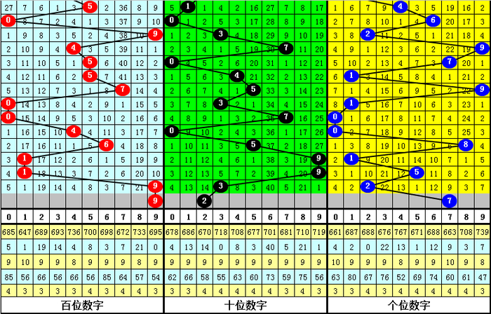 其中,百位奇偶比为4:3,大小比为3:4,本期百位一码参考9。