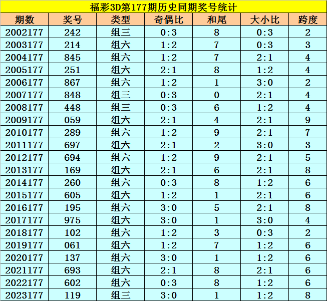 福彩3D历年第177期同期奖号为:242 214 845 251 867 848 448 059 289 697 694 169 260 605 195 975 102 061 137 693 602 119。