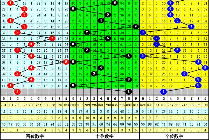 跨度分析:在第177期同期历史奖号中,号码跨度大小比为12:10,012路比为9:6:7,奇偶比为5:17,跨度开出频次分别为:跨度6出现6次,跨度4出现5次,跨度2、8出现3次,跨度3出现2次,跨度5、7、9出现1次,跨度0、1出现0次,本期关注大跨度出现,一码跨度参考6。