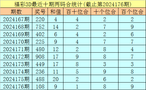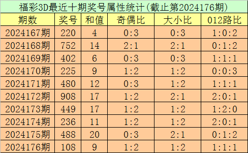 开奖回顾:第2024176期福彩3D奖号为108。奖号形态为组六,大小比为1:2,和值为9,奇偶比为1:2,012路比为1:1:1,跨度为8。
