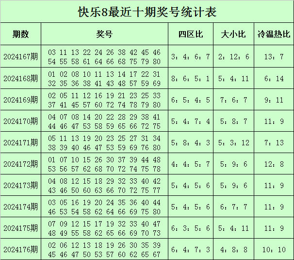 福彩快乐8第2024176期开奖回顾:02 06 12 13 18 19 26 30 35 39 45 46 47 50 53 57 60 62 65 67,其中奖号四区比为6:4:7:3,冷温热码比为4:8:8,大小比为10:10,和值为752,同尾号码为30 50 60、02 12 62、13 53、35 45 65、06 26 46、47 57 67、19 39。