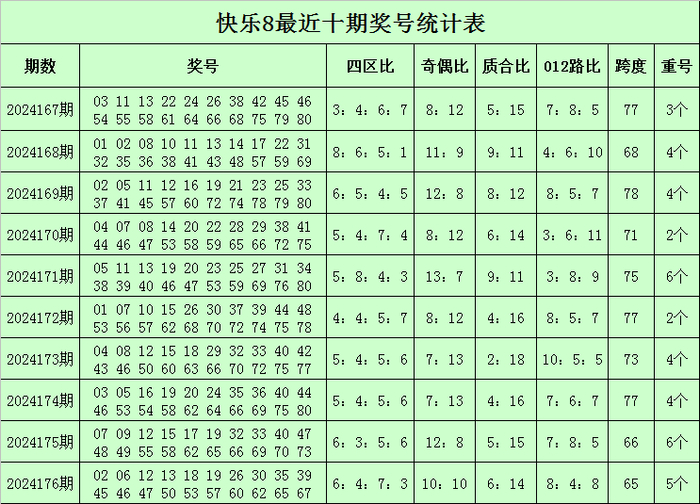 福彩快乐8第2024176期开奖回顾:02 06 12 13 18 19 26 30 35 39 45 46 47 50 53 57 60 62 65 67,其中奖号四区比为6:4:7:3,奇偶比为10:10,质合比为6:14,跨度为65,012路比为8:4:8,开出5个重号:12、19、47、62、65。