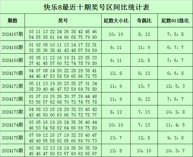 福彩快乐8第2024176期开奖回顾:02 06 12 13 18 19 26 30 35 39 45 46 47 50 53 57 60 62 65 67,其中奖号尾数奇偶比为10:10,尾数大小比为12:8,尾数012路比为10:3:7。