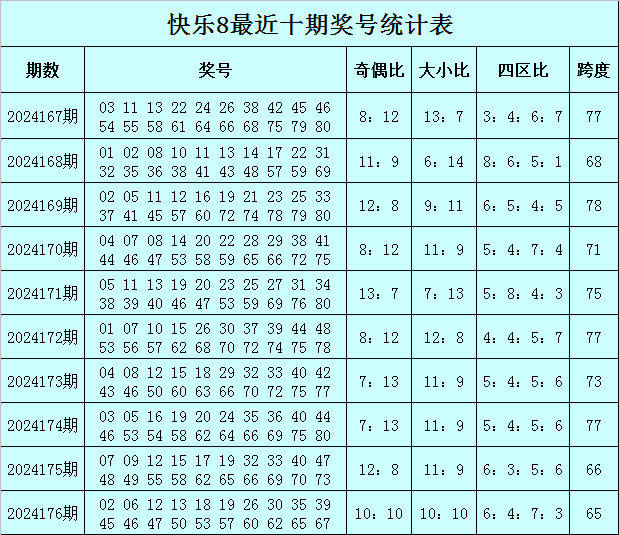 福彩快乐8第2024176期开奖回顾:02 06 12 13 18 19 26 30 35 39 45 46 47 50 53 57 60 62 65 67,其中奖号012路比为8:4:8,奖号尾数012路比为10:3:7。