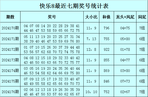 福彩快乐8第2024176期开奖回顾:02 06 12 13 18 19 26 30 35 39 45 46 47 50 53 57 60 62 65 67,其中奖号大小比开出10:10,和值为752,跨度为65,包含7组同尾号:30 50 60、02 12 62、13 53、35 45 65、06 26 46、47 57 67、19 39。
