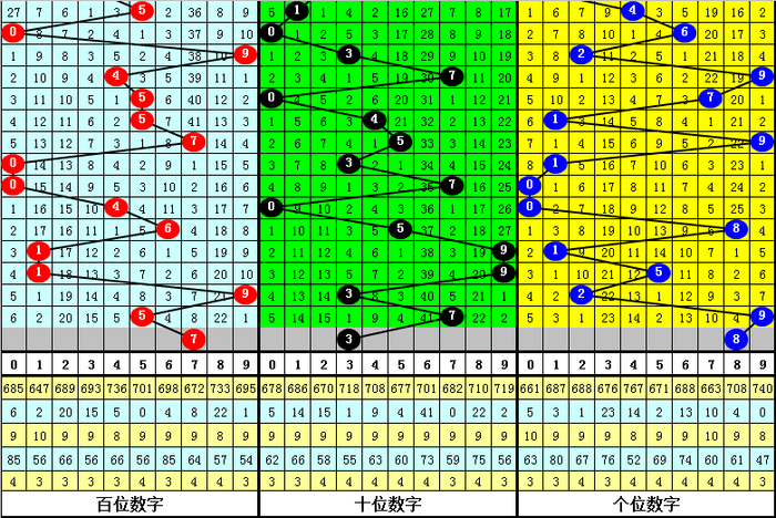 3、在以上0-9号码频次中,号码大小比为41:40,012路比为39:21:21,本期预计百位开出1路号码,参考号码7。