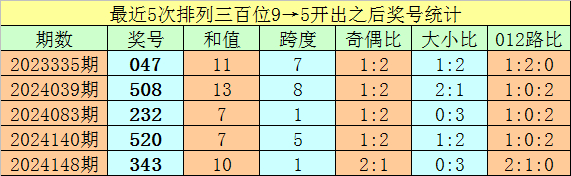 1、排列三最近两期百位号码分别开出9和5,历史上百位号码连续两期分别开出9和5的奖号出现了82期。前五期开出之后其下期奖号分别为:047、508、232、520、343;