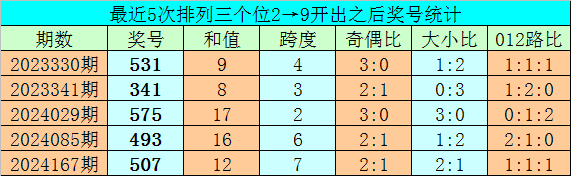 1、排列三前两期个位分别开出号码2和9,历史上个位号码连续两期分别出现2和9时,共有97次。在最近5次出现时,其下期分别出现号码:531、341、575、493、507;
