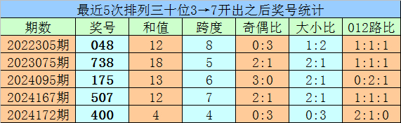1、最近两期排列三十位号码开出号码分别为3和7,历史上十位号码连续两期同时出现号码3和7的奖号共开出77期。最近五次下期开出号码为:048、738、175、507、400;