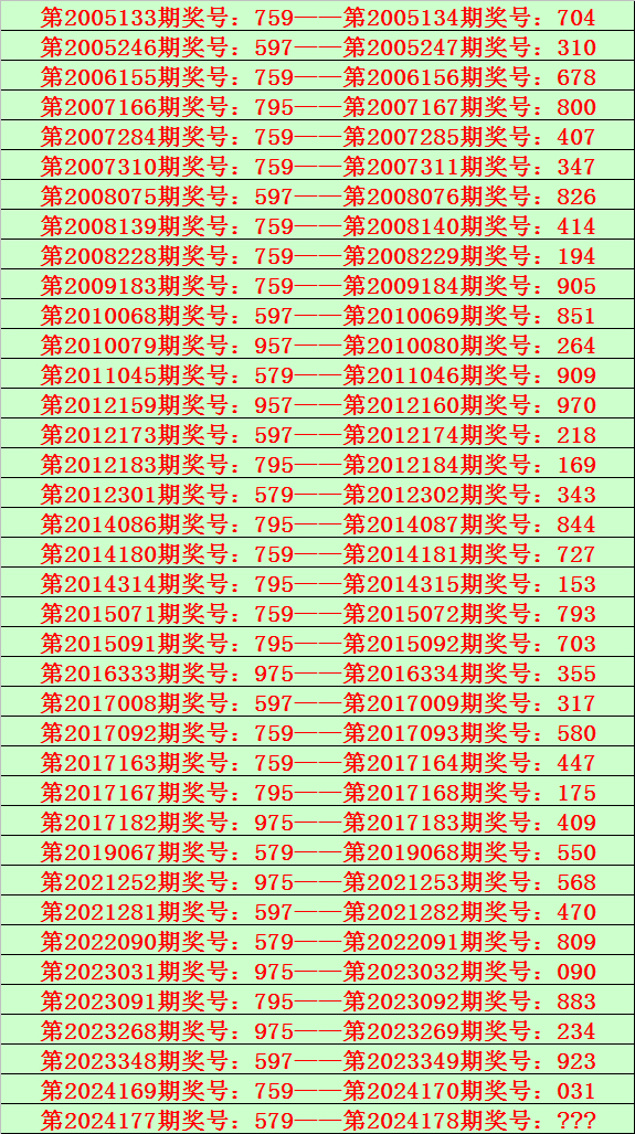 排列三第2024177期开出奖号579,该号码历史上组选出现38次,前37次开出之后期下期奖号为:704、310、678、800、407、347、826、414、194、905、851、264、909、970、218、169、343、844、727、153、793、703、355、317、580、447、175、409、550、568、470、809、090、883、234、923、031,详见下表: