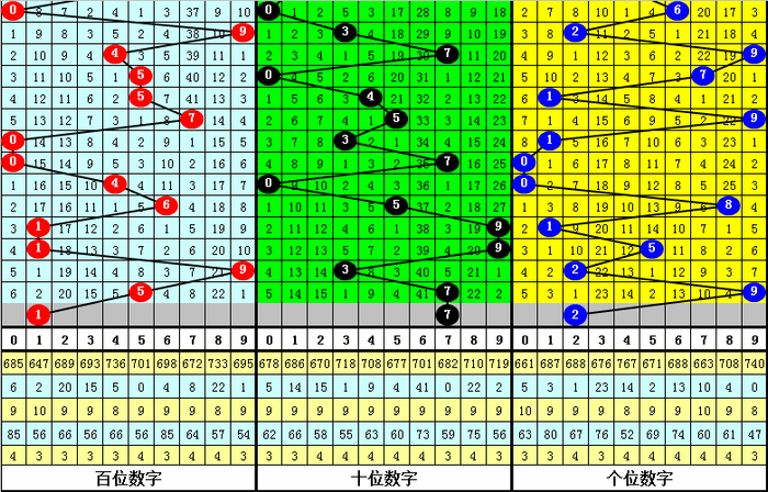 其中,百位奇偶比为3:1,大小比为3:1,本期百位一码参考1。