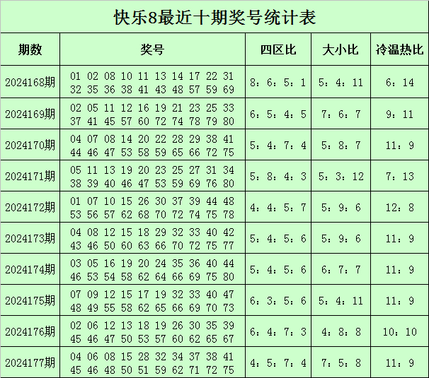 福彩快乐8第2024177期开奖回顾:04 06 08 15 28 32 34 37 38 41 45 46 48 50 51 59 62 71 72 75,其中奖号四区比为4:5:7:4,冷温热码比为7:5:8,大小比为11:9,和值为822,同尾号码为41 51 71、32 62 72、04 34、15 45 75、06 46、08 28 38 48。