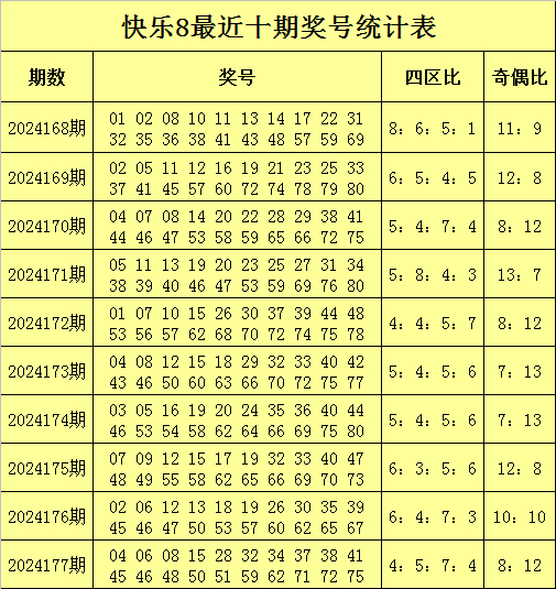 福彩快乐8第2024177期开奖回顾:04 06 08 15 28 32 34 37 38 41 45 46 48 50 51 59 62 71 72 75,其中奖号四区比为4:5:7:4,奇偶比为8:12。