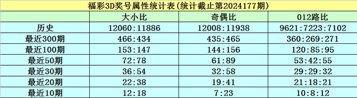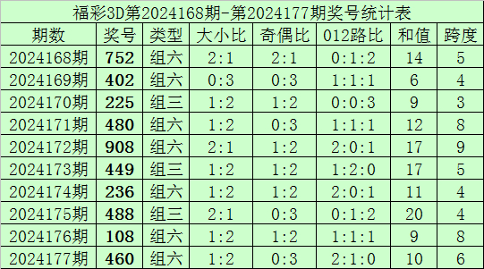 开奖回顾:福彩3D第2024177期奖号为460,其中奖号大小比为1:2,奇偶比为0:3,012路比为2:1:0,和值为10,跨度为6。