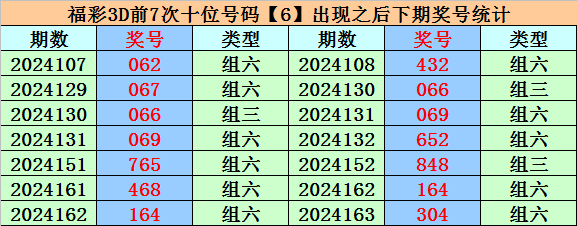 在十位开奖中,号码6前7次出现之后,下期奖号分别为:3、6、6、5、4、6、0,其中奖号大小比为4:3,012路比为5:1:1,奇偶比为2:5。
