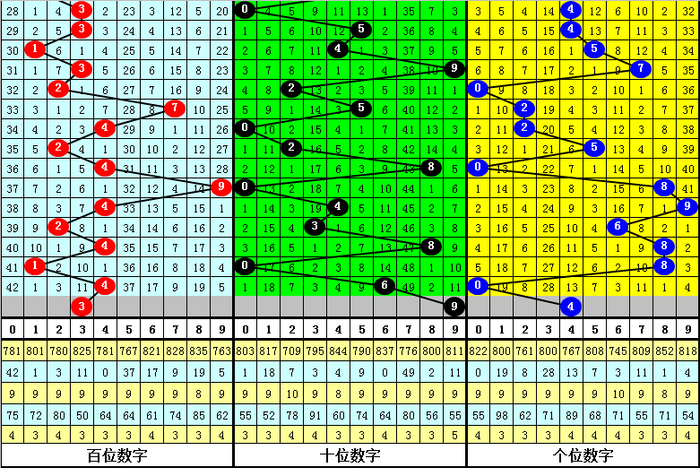 百位分析:百位上期开出号码4,历史上该位号码4出现了781次,最近100期号码4出现次,上期间隔1期再次出现。