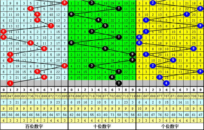 百位:近期大小 号码开出比例基本相当,大号目前连续开出3期,本期放弃大号预计小 号回补;另外,该位0路和1路号码在最近20期奖号中走势较热,2路号码表现相对较冷,本期该位放弃2路号码,参考号码1。