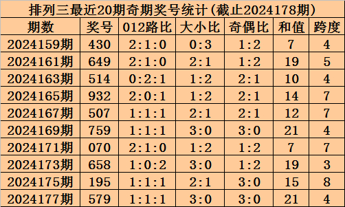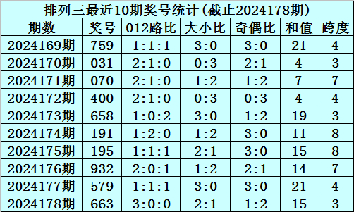 上期回顾:排列三2024178期奖号为663,奇偶比为1:2,大小比为2:1,跨度为15。