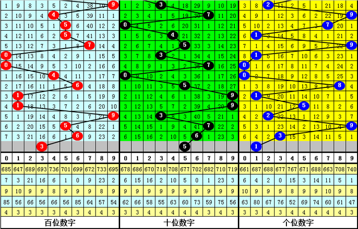 其中,百位奇偶比为2:3,大小比为3:2,本期百位一码参考3。