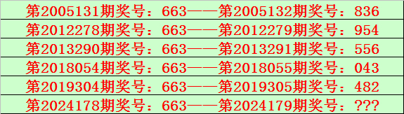 排列三第2024178期开出奖号663,该号码直选类型历史上出现了6次,前5次开出之后期下期奖号为:836、954、556、043、482,见下表: