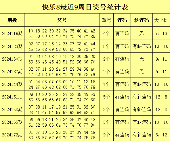 福彩快乐8第2024172期(上周日)奖号回顾:01 07 10 15 26 30 37 39 44 48 53 56 57 62 68 70 72 74 75 78,其中大小比为12:8,包含2个重号37、74,包含连码56 57、74 75。