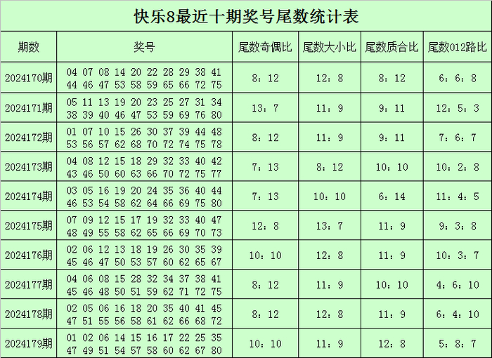 福彩快乐8第2024179期开奖回顾:01 02 06 14 15 16 17 22 25 35 47 49 51 54 57 58 60 62 67 80,其中奖号尾数奇偶比为10:10,尾数012路比为5:8:7,尾数大小比为11:9,尾数质合比为12:8。