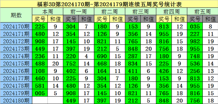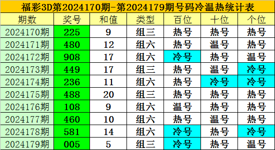上期回顾:福彩3D第2024179期开奖奖号为:005,奖号类型为:组三,奖号冷温热态为:冷号+热号+温号。