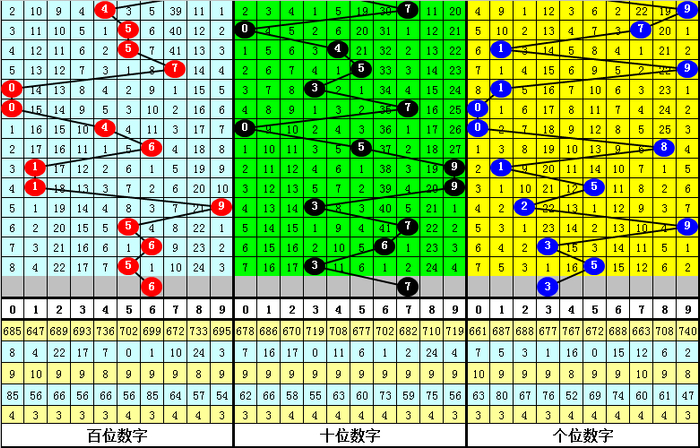 上期第二位奖号为:3,间隔2期之后开出,表现相对热,热码近期在该位非常活泼,出现了8次,本期看好该位再次开出热码,关注号码7。