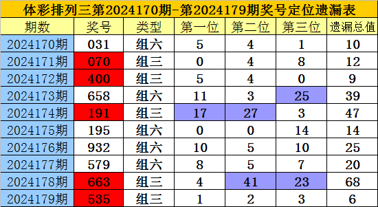开奖回顾:排列三第2024179期奖号为:535,各位号码遗漏值分别为1、2、3,遗漏总值为6。