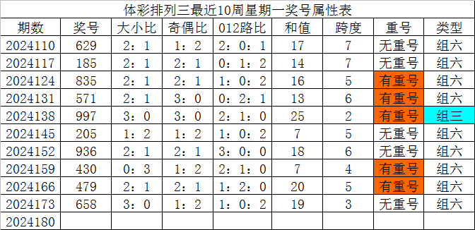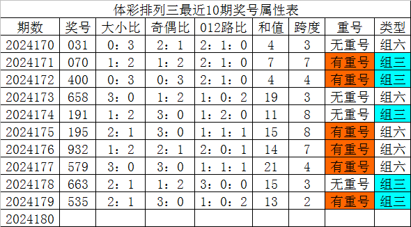 体彩排列三最近10期分别开出奖号:031、070、400、658、191、195、932、579、663、535,各奖号属性详见下表: