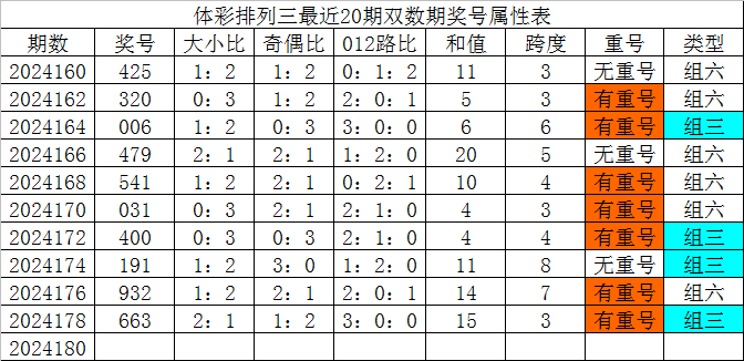 体彩排列三最近20期双数期奖号分别为:425、320、006、479、541、031、400、191、932、663,各期奖号详细属性下表: