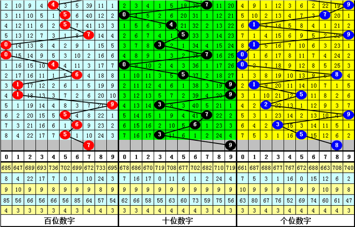 其中,号码0-9开出次数分别为:号码0开出6次、1开出4次、2开出3次、3开出4次、4开出4次、5开出2次、6开出3次、7开出1次、8开出0次、9开出3次。