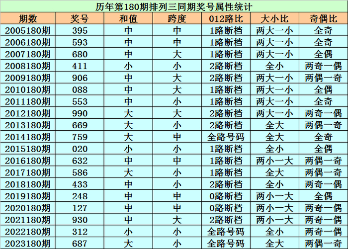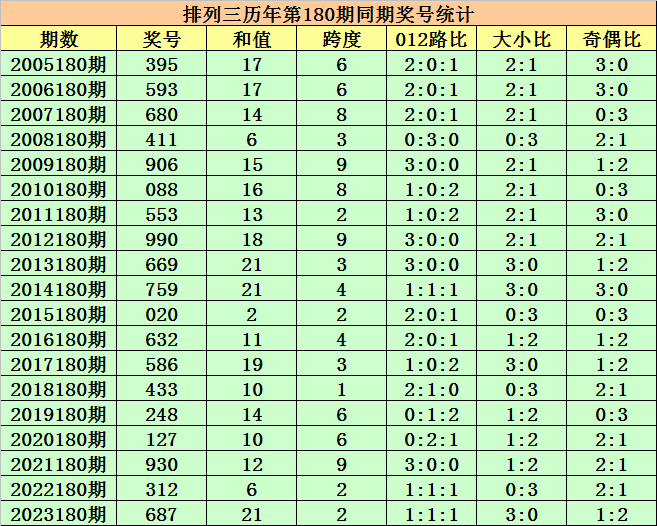 历史上第2024180期排列三已开出19期奖号了,历年同期奖号分别为:395、593、680、411、906、088、553、990、669、759、020、632、586、433、248、127、930、312、687,详细统计见下表: