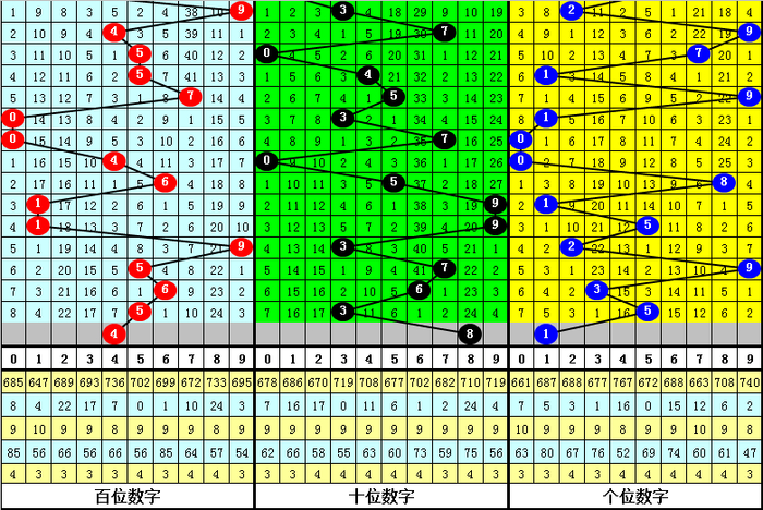 和尾分布,连续10期和尾开出:4、7、4、9、1、5、4、1、5、3,奇偶比开出7:3,大小比开出4:6,012路比开出2:6:2,本期适当关注和尾重复出现3。本期和值关注13。